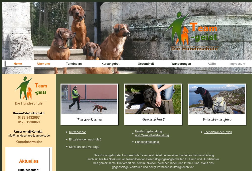 Das Kursangebot der Hundeschule Teamgeist bietet neben einer fundierten Basisausbildung auch ein breites Spektrum an teambildenden Beschäftigungsmöglichkeiten für Hund und Hundeführer. Das gemeinsame Tun fördert die Kommunikation zwischen Ihnen und Ihrem Hund, stärkt das gegenseitige Vertrauen und beugt Verhaltensauffälligkeiten vor .