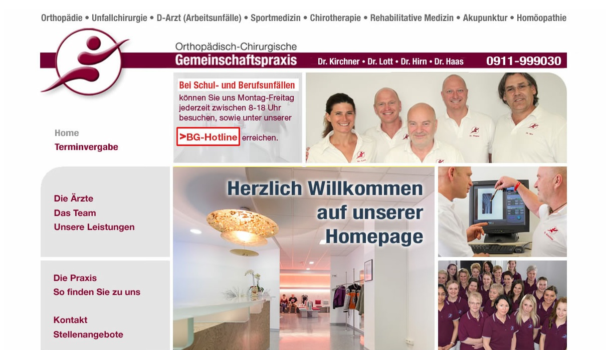 Dr. Kirchner, Dr. Lott, Dr. Hirn, Dr. Haas, Nürnberg, Orthopädisch-chirurgische Praxis, Orthopädie, Chirurgie. Unfallchirurgie. Sportmedizin, Berufsunfälle, Chirotherapie, Sozialmedizin, Akupunktur, Ambulante Operationen,