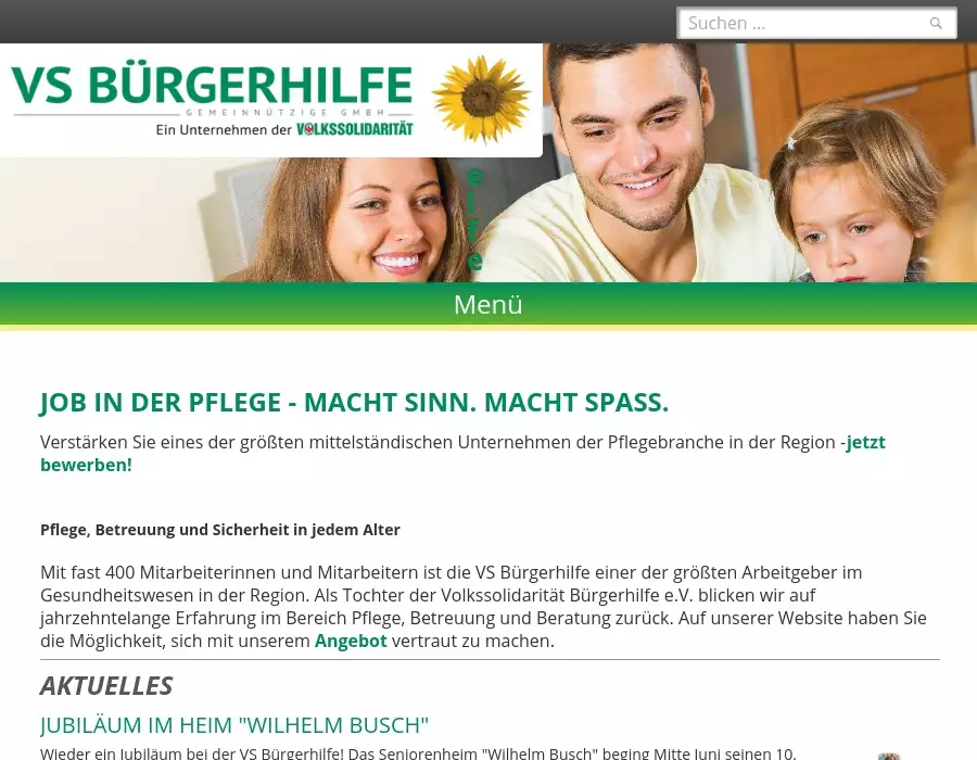 Mit fast 400 Mitarbeiterinnen und Mitarbeitern ist die VS Bürgerhilfe einer der größten Arbeitgeber im Gesundheitswesen in der Region. Als Tochter der Volkssolidarität Bürgerhilfe e.V. blicken wir auf jahrzehntelange Erfahrung im Bereich Pflege, Betreuung und Beratung zurück. Auf unserer Website haben Sie die Möglichkeit, sich mit unserem Angebot vertraut zu machen.