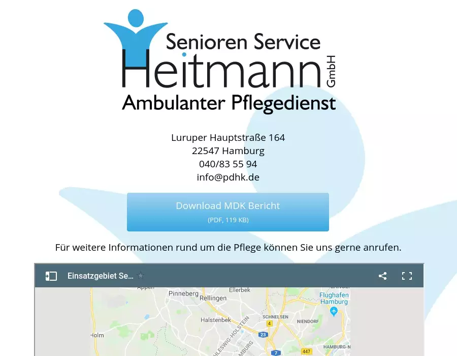 Webvisitenkarte des Senioren Service HeitmannLuruper Hauptstraße 16422547 Hamburg040/83 55 94info@pdhk.de