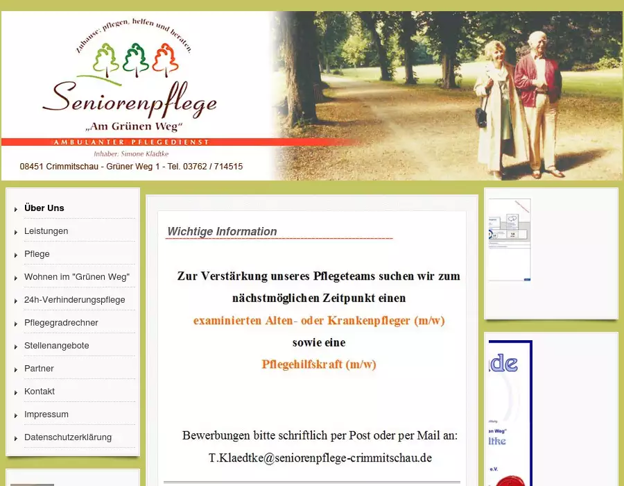 Webseite der Seniorenpflege Crimmitschau. Inhaberin Simone Klaetke.Über Uns¯¯¯¯¯¯¯¯¯¯¯¯¯¯¯¯¯¯¯¯¯¯¯¯¯¯¯¯¯¯¯¯¯¯¯¯¯¯¯¯¯¯¯¯¯¯¯¯¯¯¯¯¯¯¯¯¯¯¯¯¯¯Der bestehende Pflegedienst „Seniorenpflege Am Grünen Weg“ wurde im Jahr 2006 gegründet und steht in privater Trägerschaft.