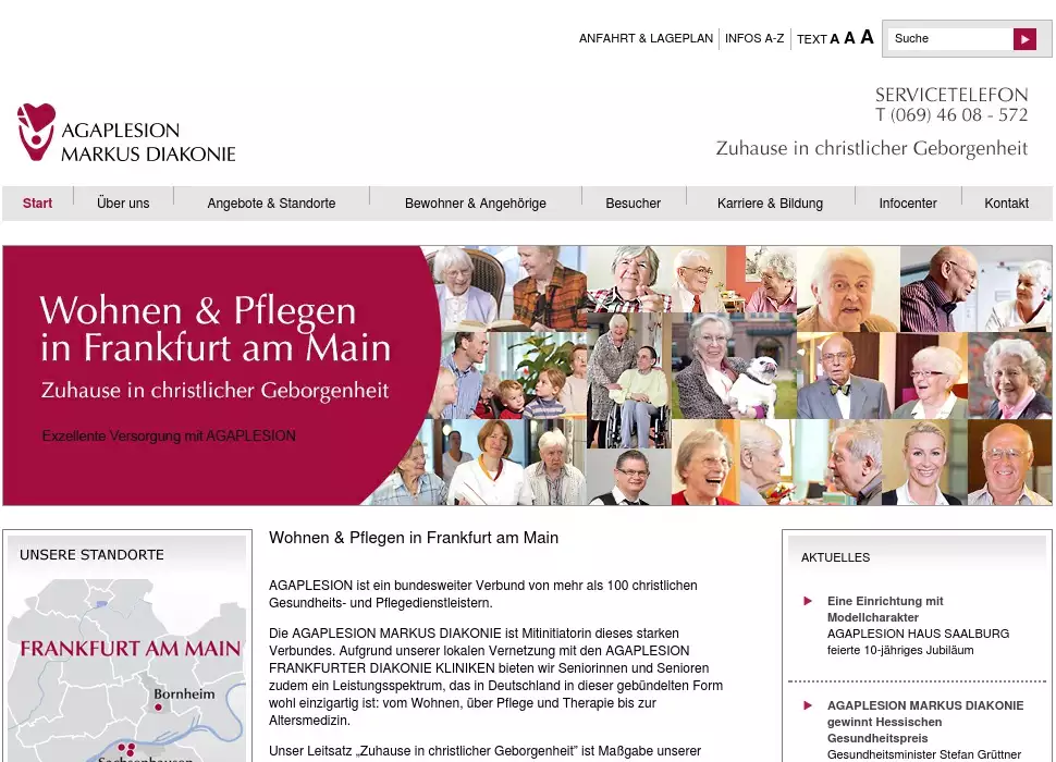 Die AGAPLESION MARKUS DIAKONIE ist Mitinitiatorin dieses starken Verbundes. Aufgrund unserer lokalen Vernetzung mit den AGAPLESION FRANKFURTER DIAKONIE KLINIKEN bieten wir Seniorinnen und Senioren zudem ein Leistungsspektrum, das in Deutschland in dieser gebündelten Form wohl einzigartig ist: vom Wohnen, über Pflege und Therapie bis zur Altersmedizin.