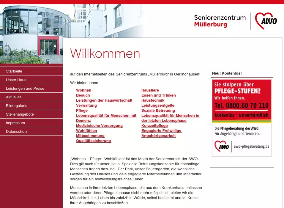Das Haus Müllerburg ist ein Seniorenzentrum der AWO in Oerlinghausen im Kreis Lippe. Es bietet Seniorinnen und Senioren in ansprechender Atmosphäre und schöner Umgebung fachlich qualifizierte stationäre Pflege, Kurzzeitpflege und die Möglichkeiten des Projektes "Leben bis zuletzt". Kurz: Wohnen, Pflege, Wohlfühlen.AWO,Arbeiterwohlfahrt,Oerlinghausen,Lippe,Müllerburg,Seniorenzentrum,Altenheim,Pflege,Kurzzeitpflege,Demenz,Leben bis zuletzt,Hospiz,Pflegeversicherung,Senior,Sinnesgarten,Servicewohnen,betreutes Wohnen,Am Kalderbergauf den Internetseiten des Seniorenzentrums „Müllerburg“ in Oerlinghausen!