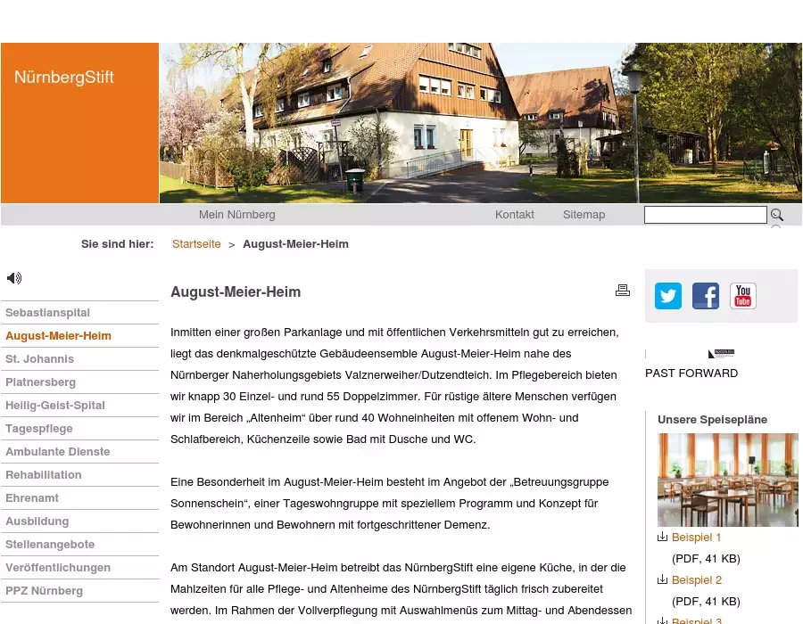Inmitten einer großen Parkanlage und mit öffentlichen Verkehrsmitteln gut zu erreichen, liegt das denkmalgeschützte Gebäudeensemble August-Meier-Heim nahe des Nürnberger Naherholungsgebiets Valznerweiher/Dutzendteich. Im Pflegebereich bieten wir knapp 30 Einzel- und rund 55 Doppelzimmer. Für rüstige ältere Menschen verfügen wir im Bereich „Altenheim“ über rund 40 Wohneinheiten mit offenem Wohn- und Schlafbereich, Küchenzeile sowie Bad mit Dusche und WC.