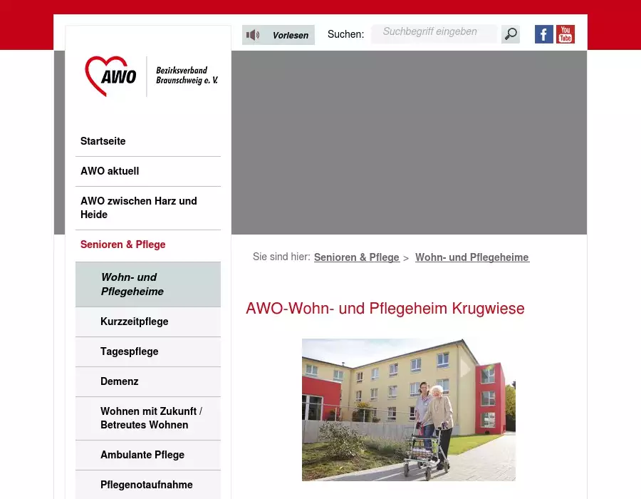 Pflegeheim: Das AWO Wohn- und Pflegeheim Krugwiese in der Kaiserstadt GoslarPflegeheim, Altenpflege, Altersheim, Altenheim, SeniorenheimDas Wohn- und Pflegeheimliegt im ruhigen Stadtteil Georgenberg. Die Buslinien 801 und 802 fahren Haltestellen in unmittelbarer Nähe an und sorgen für eine günstige Verkehrsanbindung in die Innenstadt. Über die B6/B82 ist die Einrichtung gut mit dem PKW zu erreichen.