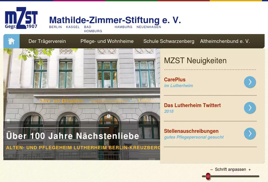 Mathilde Zimmer Stiftung e. V. - Über 100 Jahre Nächstenliebe. Wohnheime für Senioren, Pflegeheime in Berlin, Hamburg, Neuenhagen, Kassel und Bad HomburgCarePlusim Lutherheim