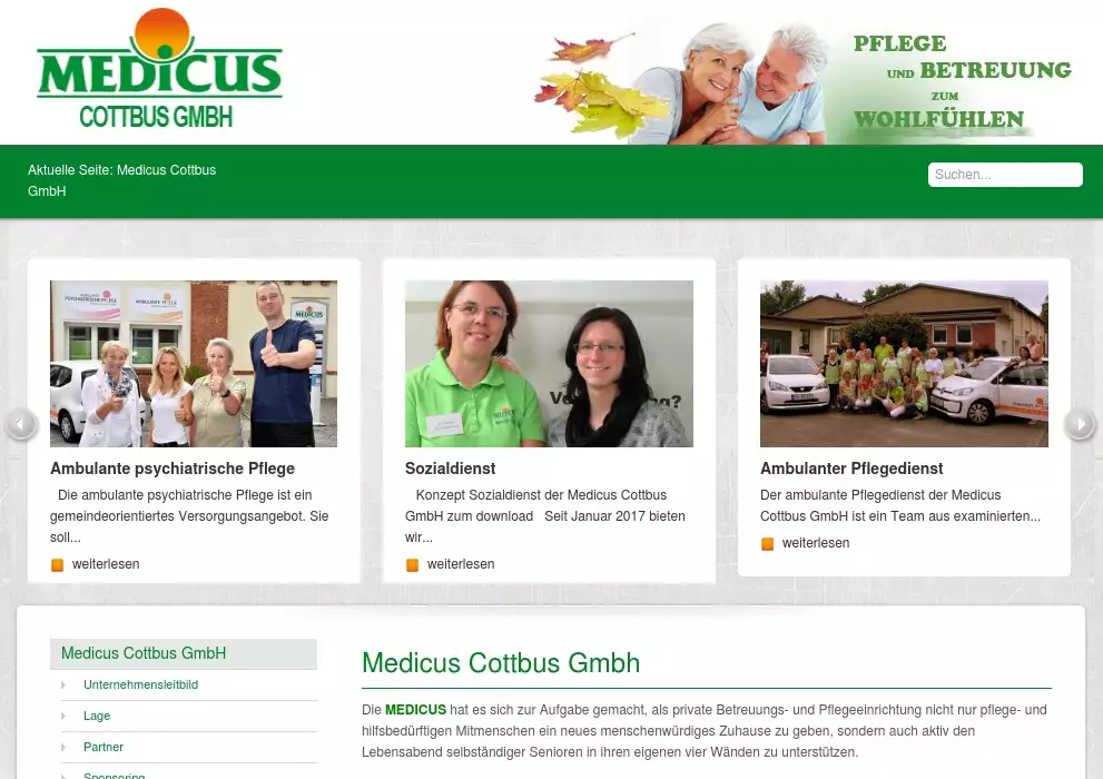 Die Medicus Cottbus GmbH bietet in Cottbus, Pflege und Betreuung an. Medicus Cottbus GmbH, PflegezentrenDie MEDICUS hat es sich zur Aufgabe gemacht, als private Betreuungs- und Pflegeeinrichtung nicht nur pflege- und hilfsbedürftigen Mitmenschen ein neues menschenwürdiges Zuhause zu geben, sondern auch aktiv den Lebensabend selbständiger Senioren in ihren eigenen vier Wänden zu unterstützen.