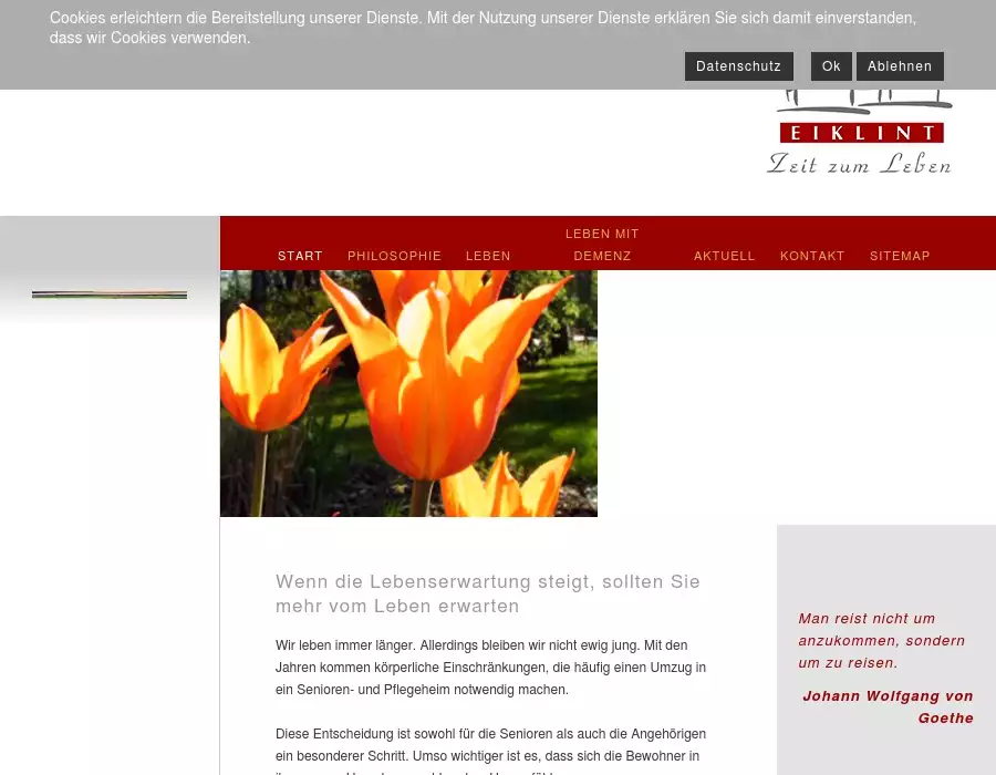 Wir leben immer länger. Allerdings bleiben wir nicht ewig jung. Mit den Jahren kommen körperliche Einschränkungen, die oft einen Umzug in ein Senioren- und Pflegeheim notwendig machen. Diese 'Senioren- und Pflegeheim Eiklint GmbH', seniorenheim, pflegeheim, altersheim, celle, demenz, dement, heim, seniorenresidenz, pflege, härtefall, leben, jahren, senioren, hause, fühlen, bewohner, wichtiger, eiklint, umgebung, alter, pflege, bieten, späten, schritt, lebensgenuss, entscheidung, körperliche, länger, erwarten, einschränkungenWir leben immer länger. Allerdings bleiben wir nicht ewig jung. Mit den Jahren kommen körperliche Einschränkungen, die häufig einen Umzug in ein Senioren- und Pflegeheim notwendig machen. Diese Entscheidung ist sowohl für die Senioren als auch die Angehörigen ein besonderer Schritt. Umso wichtiger ist es, dass sich die Bewohner in ihrer neuen Umgebung wohl und zu Hause fühlen. Das EIKLINT steht für Lebensgenuss und Würde in jedem Alter: Denn das Leben sollte auch in späten Jahren mehr bieten als gute Pflege. Zeit zum Leben.