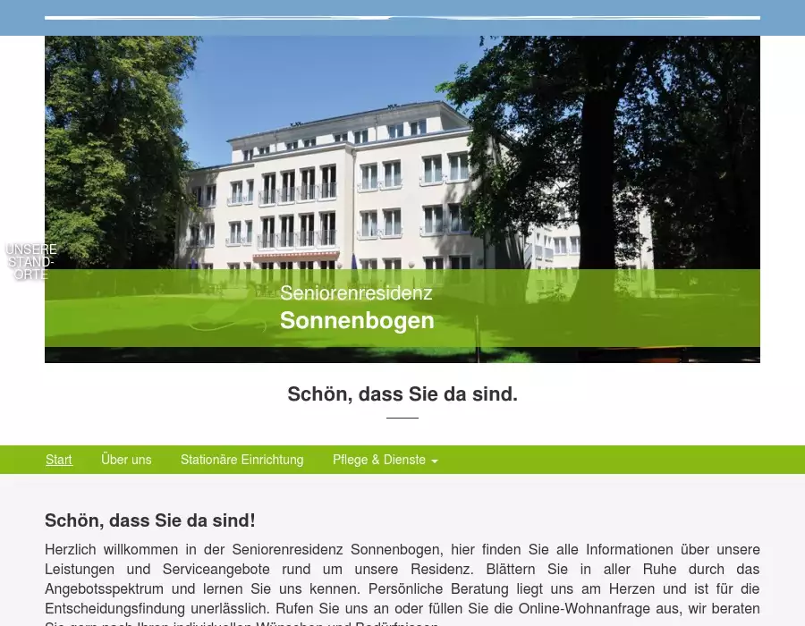 Herzlich willkommen in der Seniorenresidenz Sonnenbogen, hier finden Sie alle Informationen über unsere Leistungen und Serviceangebote rund um unsere Residenz. Blättern Sie in aller Ruhe durch das Angebotsspektrum und lernen Sie uns kennen. Persönliche Beratung liegt uns am Herzen und ist für die Entscheidungsfindung unerlässlich. Rufen Sie uns an oder füllen Sie die Online-Wohnanfrage aus, wir beraten Sie gern nach Ihren individuellen Wünschen und Bedürfnissen.