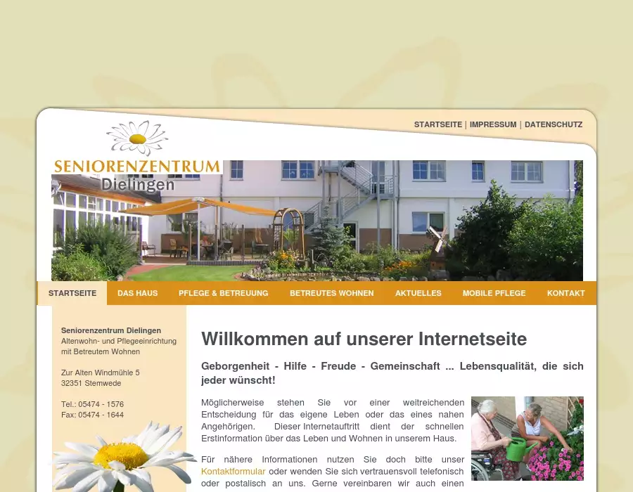 Altenwohn- und Pflegeeinrichtung mit Betreutem WohnenSeniorenzentrum,Dielingen,Pflege,Pflegeeinrichtung,Betreuung,Betreutes,Wohnen,Mobile,Pflege,KurzzeitpflegeMöglicherweise stehen Sie vor einer weitreichenden Entscheidung für das eigene Leben oder das eines nahen Angehörigen. DieserInternetauftritt dient der schnellen Erstinformation über das Leben und Wohnen in unserem Haus.