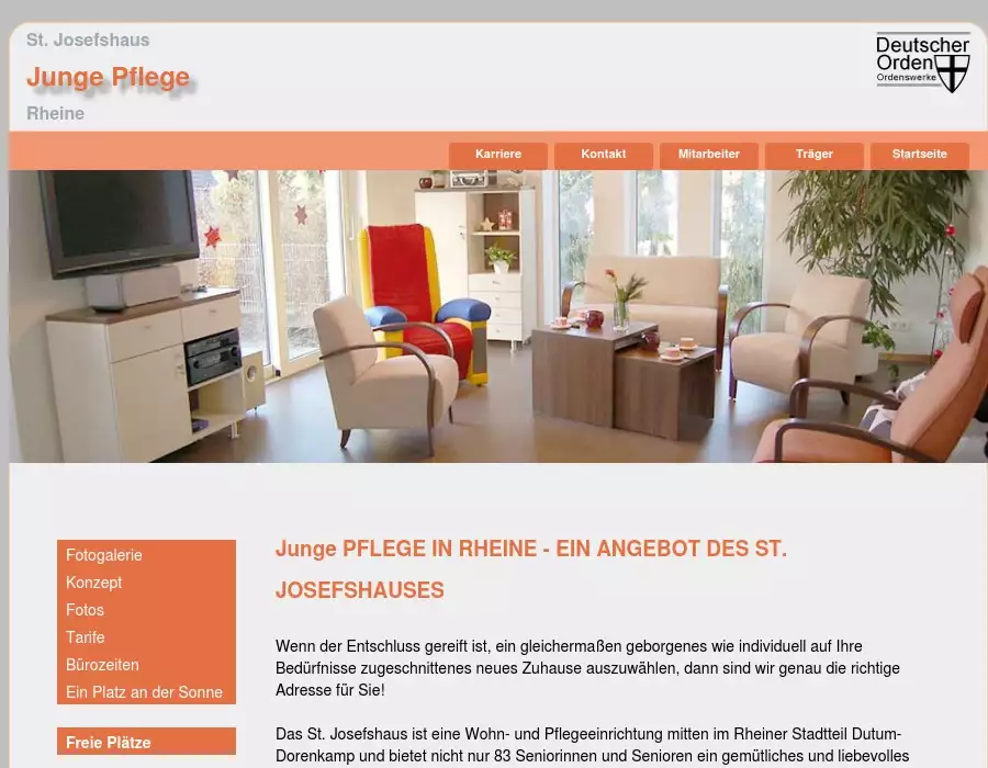 Junge Pflege in Rheine - EIN ANGEBOT DES ST. JOSEFSHAUSESJunge Pflege, Altenheim, Altenhilfe-Einrichtung, St. Josefshaus, Rheine, Deutscher Orden, Ordenswerke, Träger, AltenhilfeEckenerstraße 46-50 • 48431 Rheine • Tel.: + 49 (0) 5971 16027-0