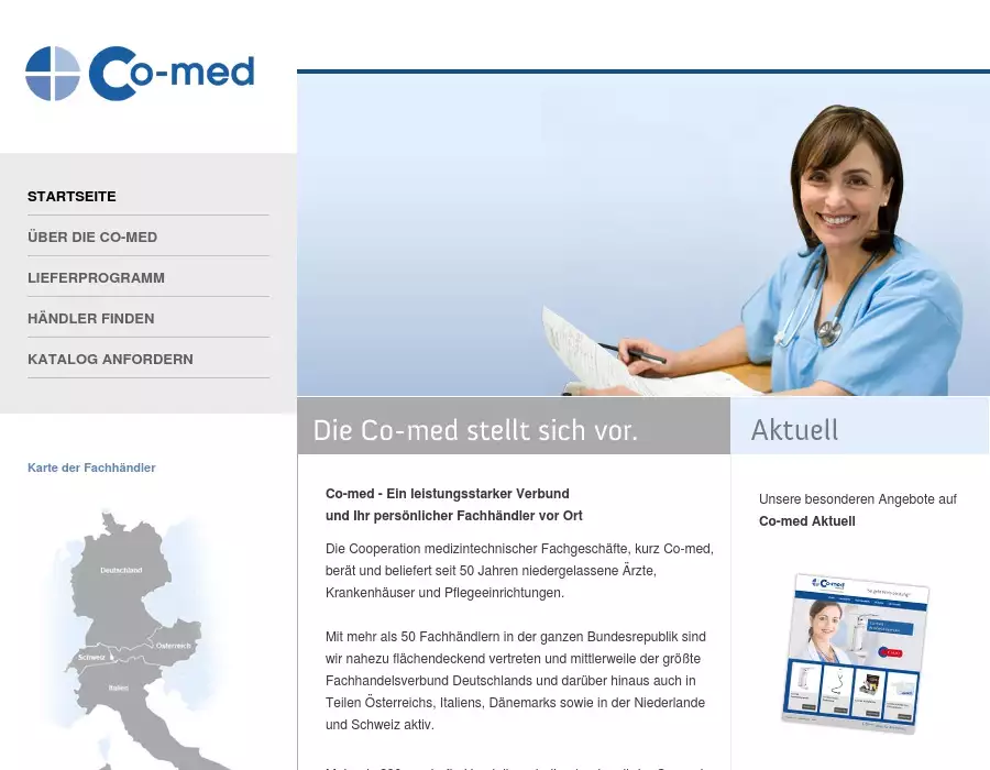 In der Co-med Unternehmensgruppe arbeiten über 60 selbständige Fachhandelsfirmen in Deutschland zusammen, um Sie durch gemeinsamen Einkauf schnell und günstig zu beliefern.Sprechstundenbedarf, Krankenhausbedarf, Arztbedarf, Laborbedarf, Medizintechnik, Onlineshop, Diagnostik, Hygenie, Labor, Instrumente, Ergometrie, Notfallprogramm, Arbeitsmedizin, VerbrauchsmaterialDie Cooperation medizintechnischer Fachgeschäfte, kurz Co-med, berät und beliefert seit 50 Jahren niedergelassene Ärzte, Krankenhäuser und Pflegeeinrichtungen.Mit mehr als 50 Fachhändlern in der ganzen Bundesrepublik sind wir nahezu flächendeckend vertreten und mittlerweile der größte Fachhandelsverbund Deutschlands und darüber hinaus auch in Teilen Österreichs, Italiens, Dänemarks sowie in der Niederlande und Schweiz aktiv.