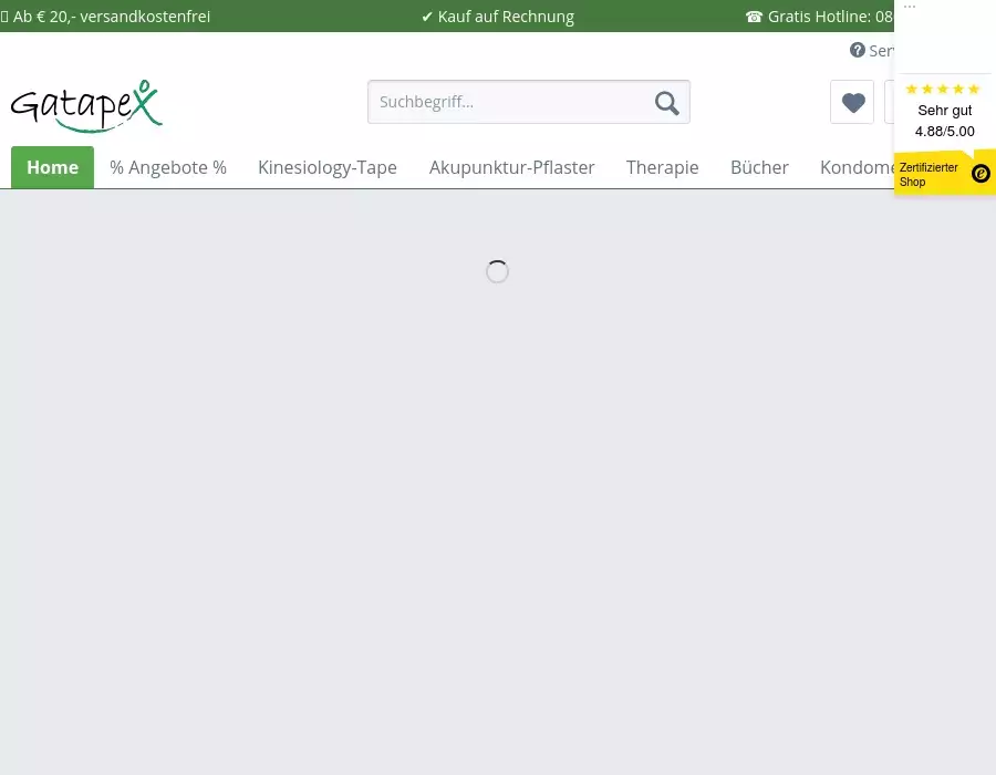 Online-Shop zum Thema Kinesiology-Tape, Akupunkturpflaster und Sportmedizin. Umfangreiches Produktsortiment mit den neusten Produkten. Blitzschneller Versand, komfortabel einkaufen.kinesio, akupunkturpflaster, physiotape, kinseo, gatapex, kindmax, precut, bandagen, online, kaufen, shopGatapex bietet Ihnen einen Onlineshop für Kinesio-Tape, Sportbandagen undGesundheitsbandagen, sowie Akupunkturpflaster und Zubehör fürSportmedizin und Physiotherapie. In den Kategorien Precut, Kinesio-Tape, Bandagen, Sporttape und Zubehör wird Ihnen ein umfangreiches Angebotrund um das Thema Sportmedizin präsentiert. Für nahezu jede Sportart und Indikation finden Sie hier die richtige Auswahl. Übersichtlich und klar sortiert wird Ihnen schnell bei der Suche nach Ihrer Bandage oder Kinesio-Tape geholfen. Unsere Produktestützen und schützen nicht nur im Sport, sondern auch im Alltag. KaufenSie ohne Risiko. Wir nehmen den Artikel zurück (siehe Widerruf) undversenden sogar ab € 20,- kostenfrei innerhalb Deutschlands. Bitte beachten Sie,dass unser Angebot ständig erweitert wird. Sollten Sie einmal nichtweiter wissen, zögern Sie bitte nicht uns zu kontaktieren. Gerne beraten wir Sie und helfen Ihnen weiter.