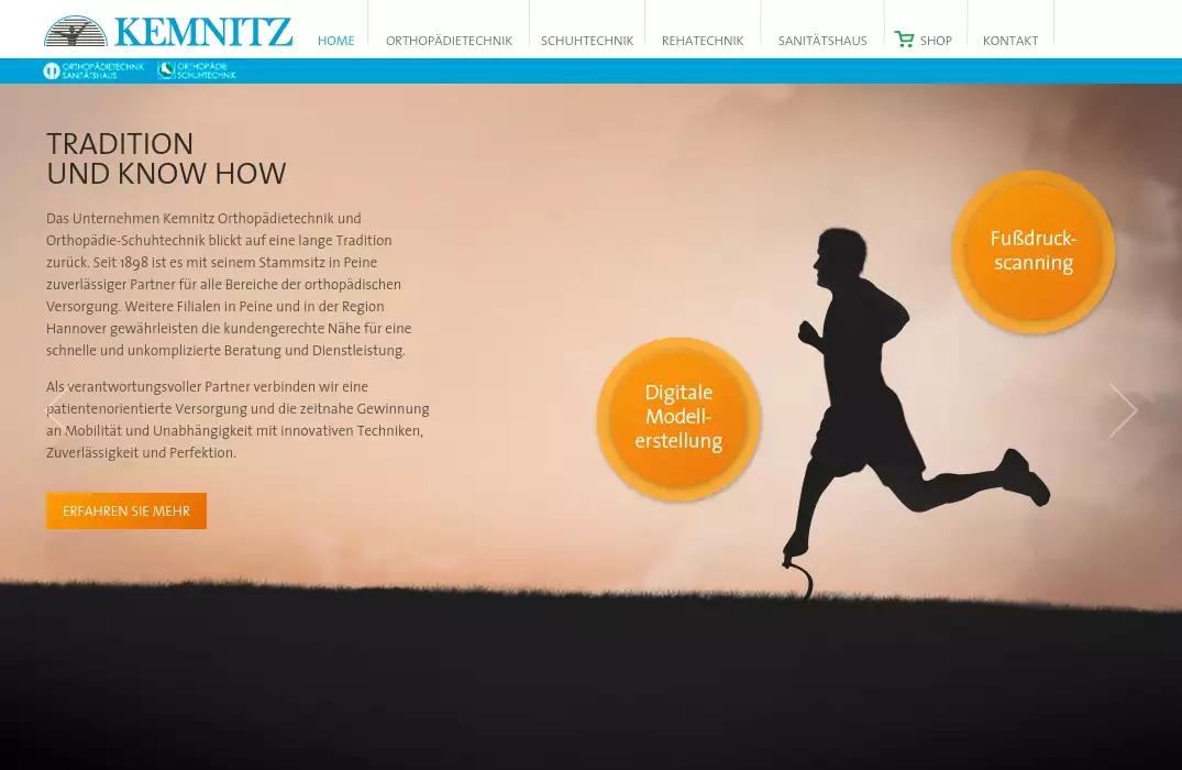 Im Sanitätshaus Kemnitz in Peine bieten wir Ihnen eine Vielzahl an Produkten, fertigen individuell Prothesen, Orthesen und sensomotorische Einlagen für sie an.Sanitätshaus, Kemnitz, Peine, Hannover, Orthopädietechnik, Orthopädieschuhtechnik, Rehatechnik, Beinprothesen, Beinorthesen, Kompressionsstrümpfe, Bandagen, sensomotorische Einlagen, Prothesen, Orthesen, orthopädische Einlagen, Laatzen, SehndeDas Unternehmen Kemnitz Orthopädietechnik und Orthopädie-Schuhtechnik blickt auf eine lange Tradition zurück. Seit 1898 ist es mit seinem Stammsitz in Peine zuverlässiger Partner für alle Bereiche der orthopädischen Versorgung. Weitere Filialen in Peine und in der Region Hannover gewährleisten die kundengerechte Nähe für eine schnelle und unkomplizierte Beratung und Dienstleistung.