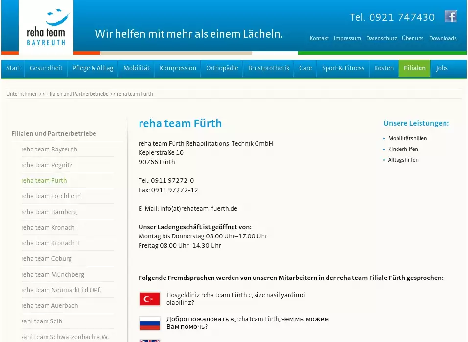 reha team Fürth Rehabilitations-Technik GmbHKeplerstraße 1090766 Fürth Tel.: 0911 97272-0Fax: 0911 97272-12 E-Mail: info(at)rehateam-fuerth.de Unser Ladengeschäft ist geöffnet von: Montag bis Donnerstag 08.00 Uhr–17.00 Uhr Freitag 08.00 Uhr–14.30 Uhr