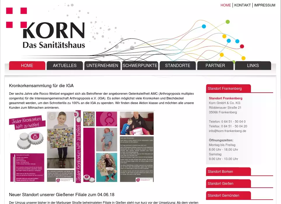 Korn GmbH & Co. KGRöddenauer Straße 2135066 FrankenbergTelefon: 0 64 51 - 50 04 0Telefax: 0 64 51 - 50 04 20info@korn-frankenberg.deÖffnungszeiten:Montag bis Freitag8.00 Uhr - 18.00 UhrSamstag9.00 Uhr - 13.00 Uhr